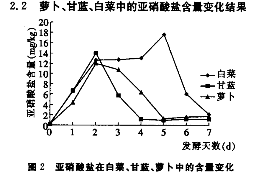 在醃製過程中,硝酸鹽被一些細菌轉化亞硝酸鹽。之後,亞硝酸鹽又會逐漸被細菌分解,所以濃度有一個先升後降的過程。
