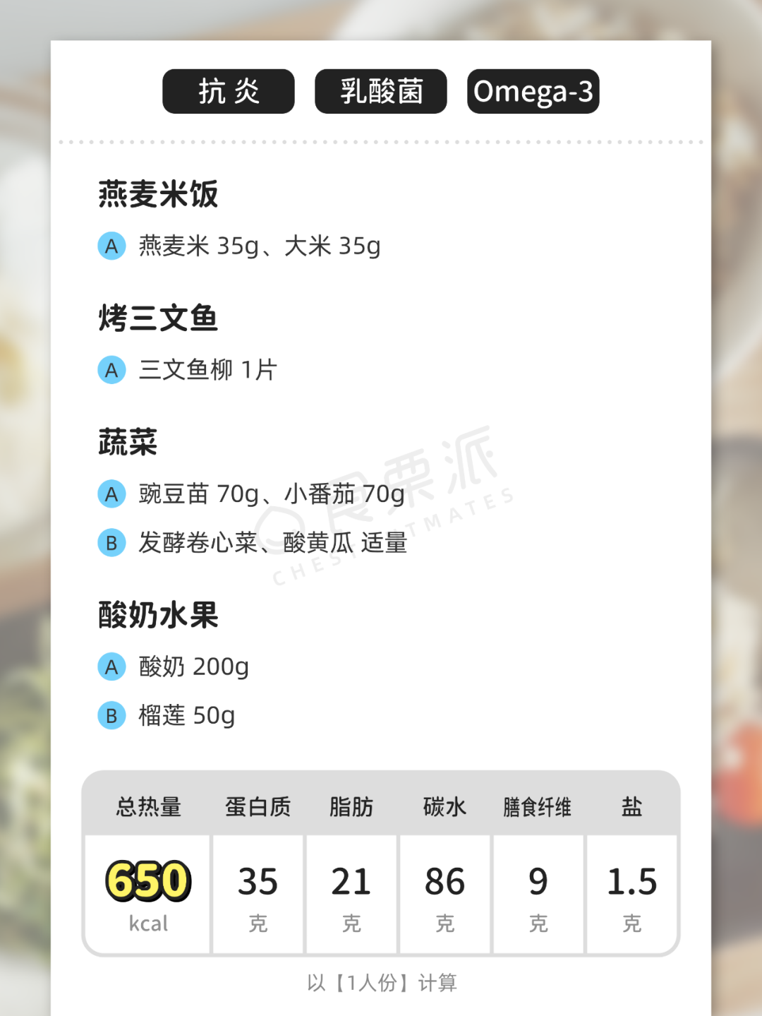 【説明】食譜的能量通常在1500~1700kcal/天左右,適合一般輕體力活動女性。男性以及身材更高大、活動量高的人覺得吃不飽,可適當增加主食和肉菜;或者找營養師(詳詢小栗子:chestnut_shanzha)幫你定製食譜。