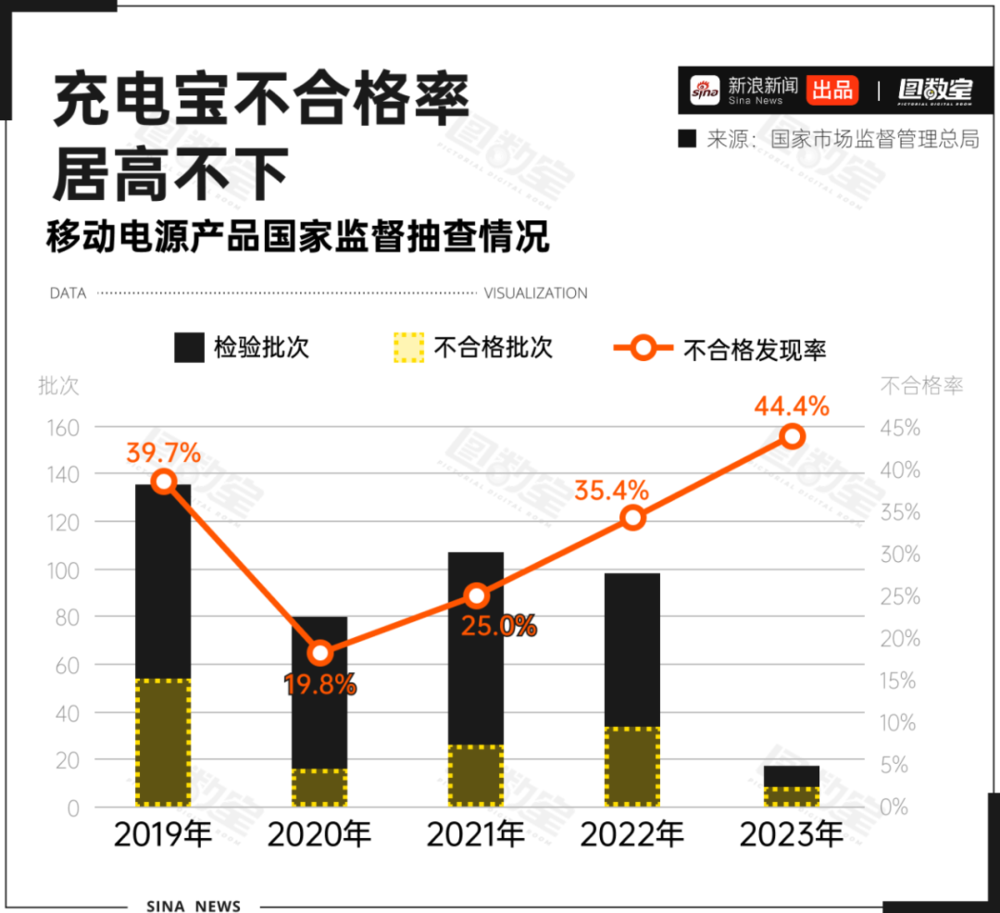 2020年到2023年,國家市場監督管理總局對網售充電寶的抽檢結果顯示,不合格率分別為19.8%、25.0%、35.4%、44.4%,逐年大漲。2024年年初國家市監總局抽查的88批次移動電源裏,過充電保護等安全項目不合格率達37.5%。