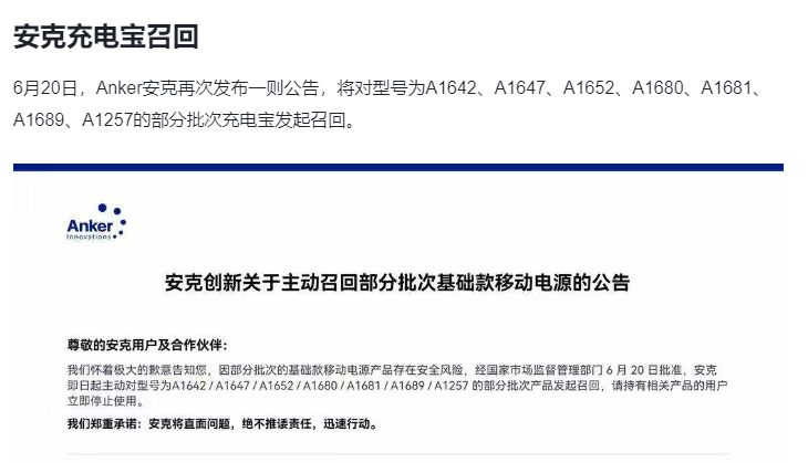 6月16日,羅馬仕宣佈召回49.17萬台充電寶,原因是電芯原材料變更導致過熱風險;僅僅4天后,一直以品質著稱的全球著名消費電子品牌安克創新也啓動71萬台產品召回,其美國市場更因19起火災事故,召回了115.8萬台充電寶。屬於是“英名差點一朝喪,丟人丟到美利堅”去了。
