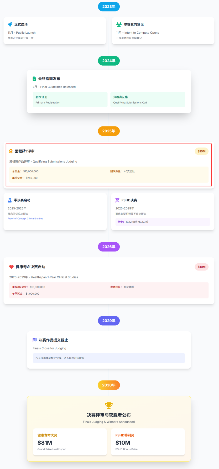 這場被譽為「抗衰界奧運」的XPRIZE Healthspan大賽,其目標為:找出一種能讓50-80歲人羣的肌肉、認知和免疫功能同時回撥至少10年(10年給6100萬$,15年給7100萬$,20年給8100萬$)的干預方案,且這種方案的干預時長不能超過1年。