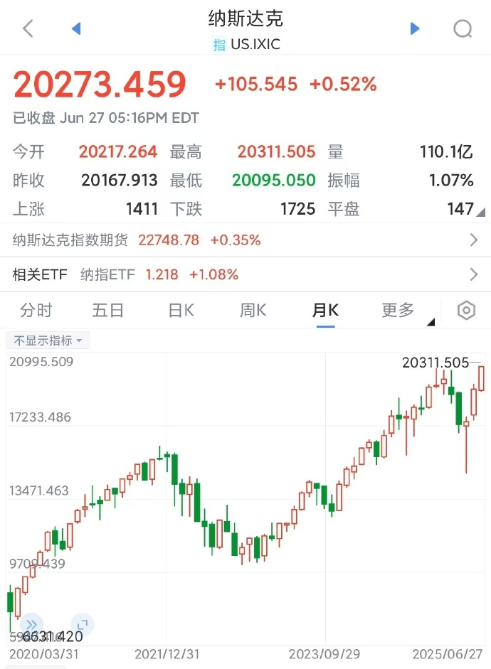 1. 昨納斯達克和標普歷史新高,道指還差點。美股前面關税戰25%的跌幅回來了。統計上,這些年美股簡單做多勝率高達90%,這個成功率是非常高的,勝過很多策略組合。如果把長度拉長到半年,也就是買了之後套了不怕等半年,那麼成功率高達96%。