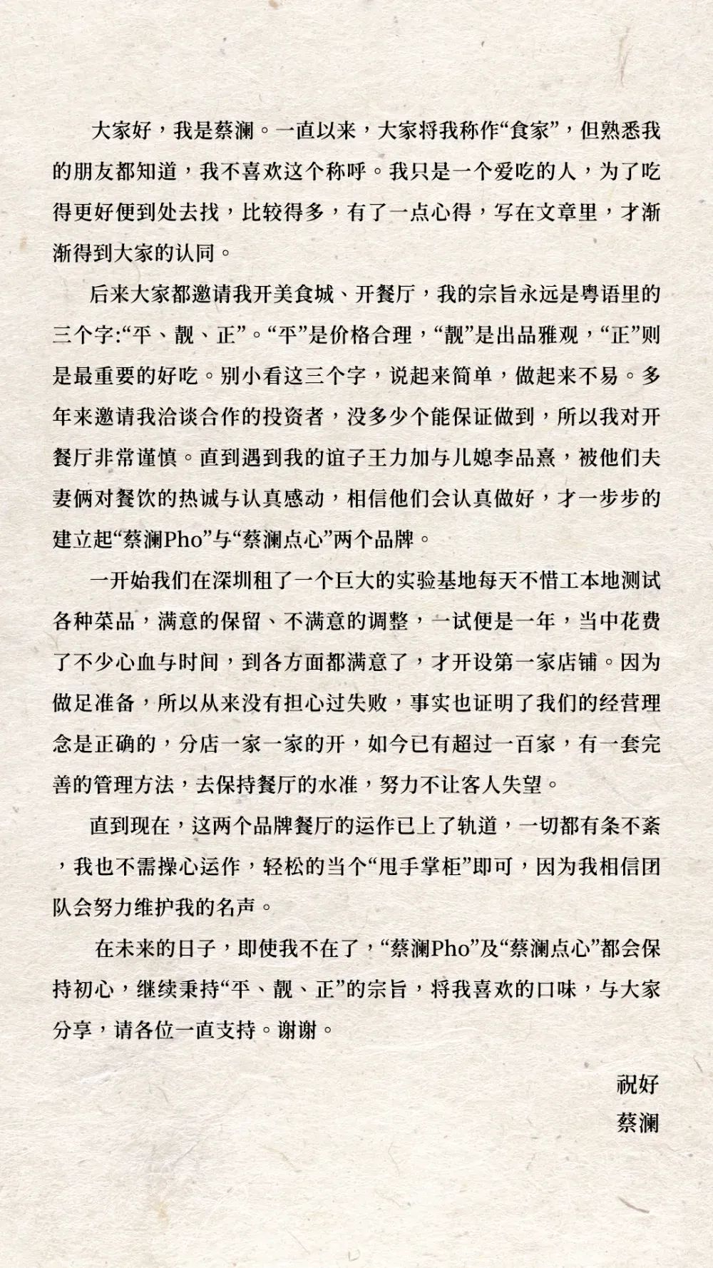 蔡瀾對餐飲行業的影響深入骨髓。他的美食專欄以幽默風趣的風格風靡數十年,讀者遍佈全球華人圈。他不僅評點美食,更親身參與餐飲實踐,近年來在內地註冊餐飲公司,在北京、深圳、廣州等城市開設線下門店。