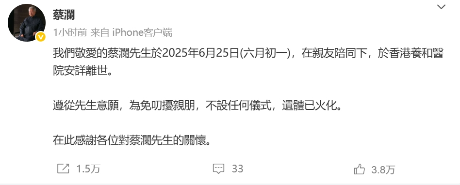 6月27日,蔡瀾微博賬號發佈一則簡短公告:“我們敬愛的蔡瀾先生於2025年6月25日(六月初一),在親友陪同下,於香港養和醫院安詳離世。遵從先生意願,為免叨擾親朋,不設任何儀式,遺體已火化。”