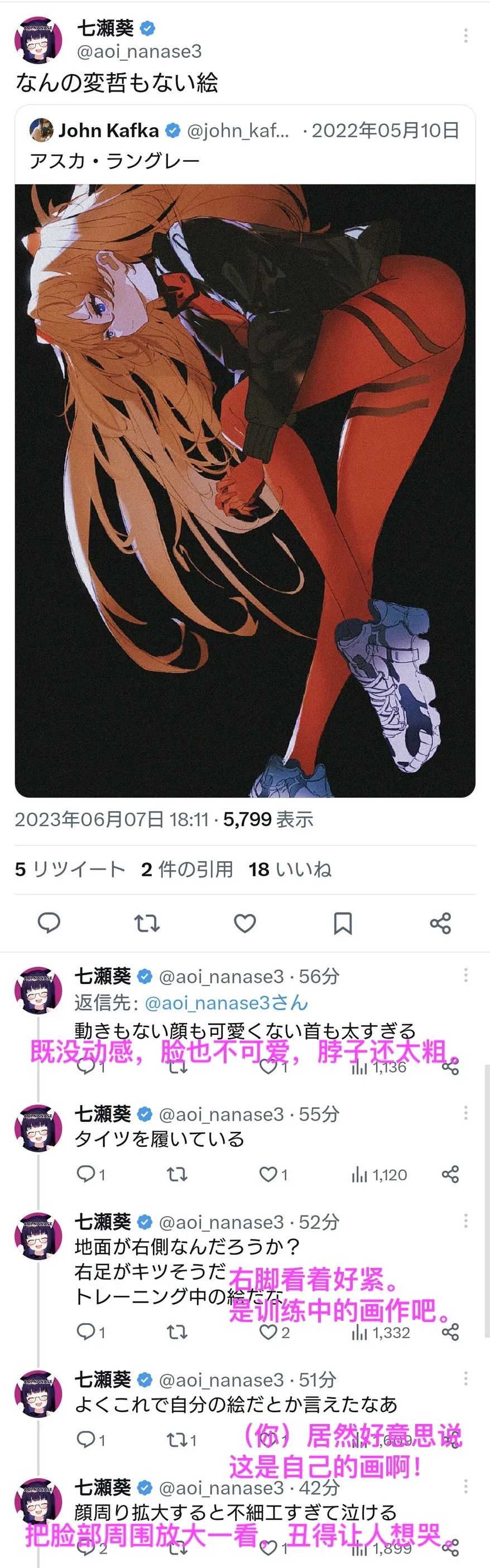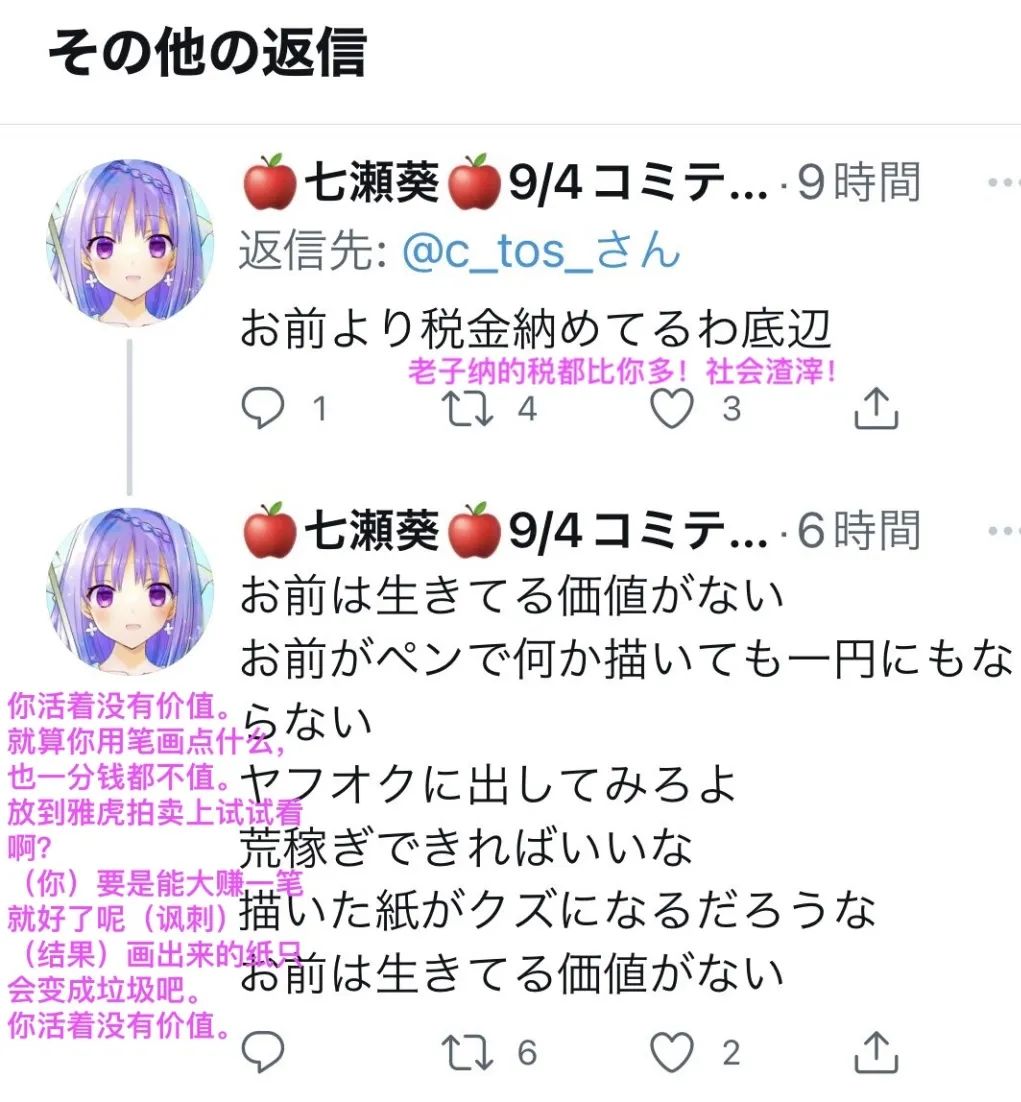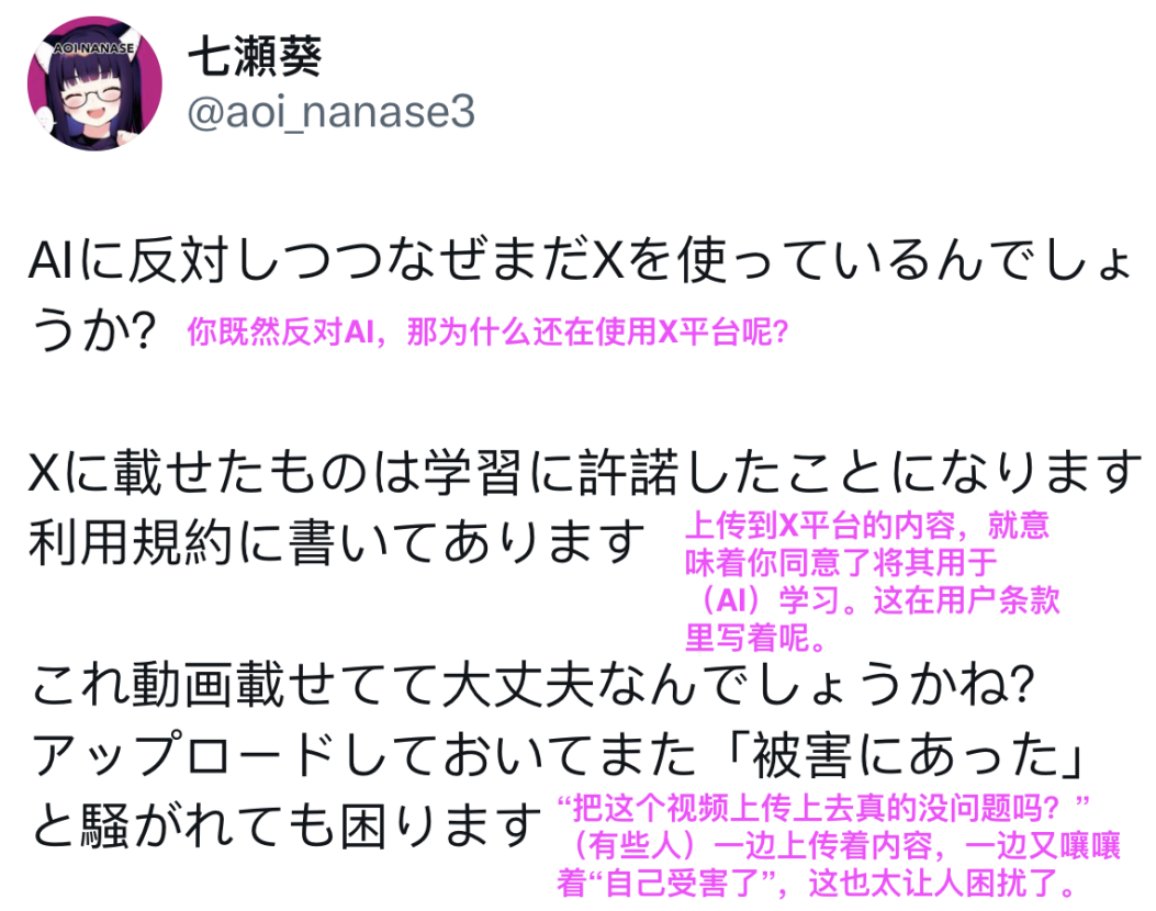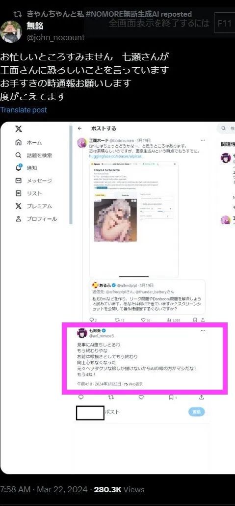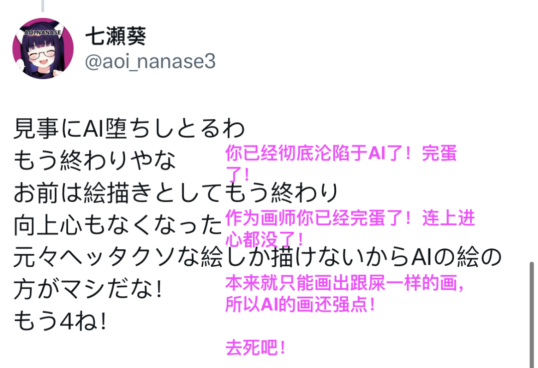 雖然很多貼子被刪除,但仍就不難看出,七瀨葵現在的【X】賬號儼然成為了一個為了維護AI創作,進行無差別爭吵和網絡霸凌的平台,言語甚至一度上升到死亡威脅。