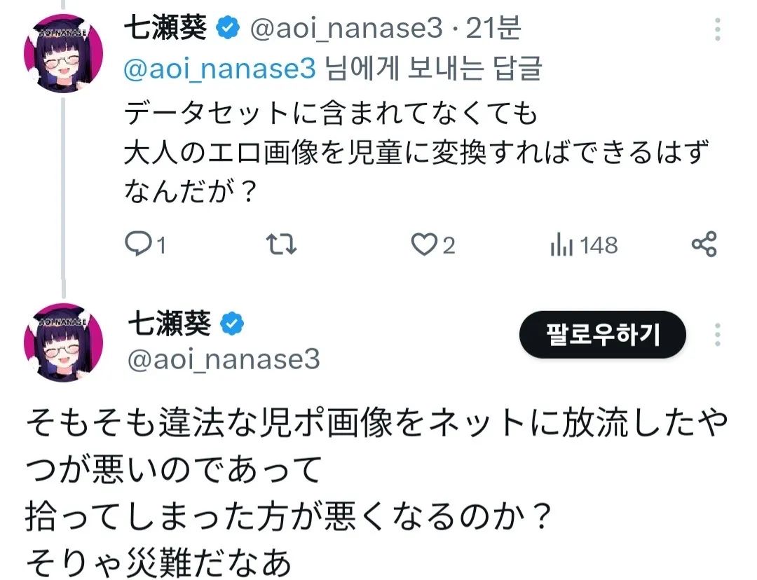 在韓國爆出有人利用真實的兒童和青少年照片製作了AI兒童色情製品的新聞時,她公開辯護:“把成人圖像轉換成兒童的有什麼錯?説到底,是那些違法把兒童圖像放到網上的傢伙不好,誤用了的人反而變成壞人了嗎?那可真是災難啊。”