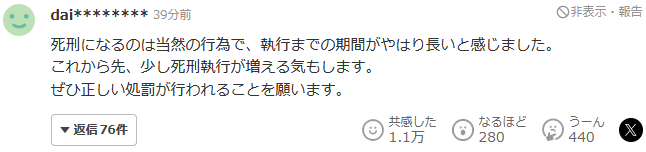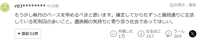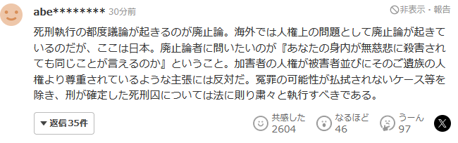 每次執行死刑,廢除死刑論都會引起爭議。在海外,廢除死刑作為人權問題在興起,但這裏是日本。我想問廢除論者:“你的親人被無情地殺害,也能説出同樣的話嗎?”反對加害者人權比受害者及其遺屬的人權更受尊重的主張。除了不能排除冤案可能性的情況外,已確定判處刑罰的死刑犯,應當依法嚴肅執行。