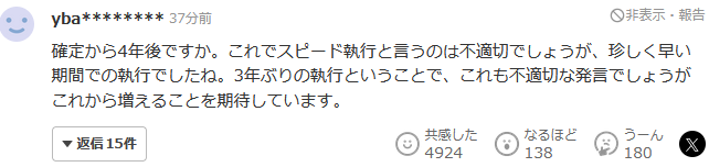 確定4年後執行嗎?這樣的速度來説,説快速執行是不恰當的。但這確實是罕見的快速執行。時隔3年再次執行,這麼説也是不恰當的,期待今後死刑會越來越多。