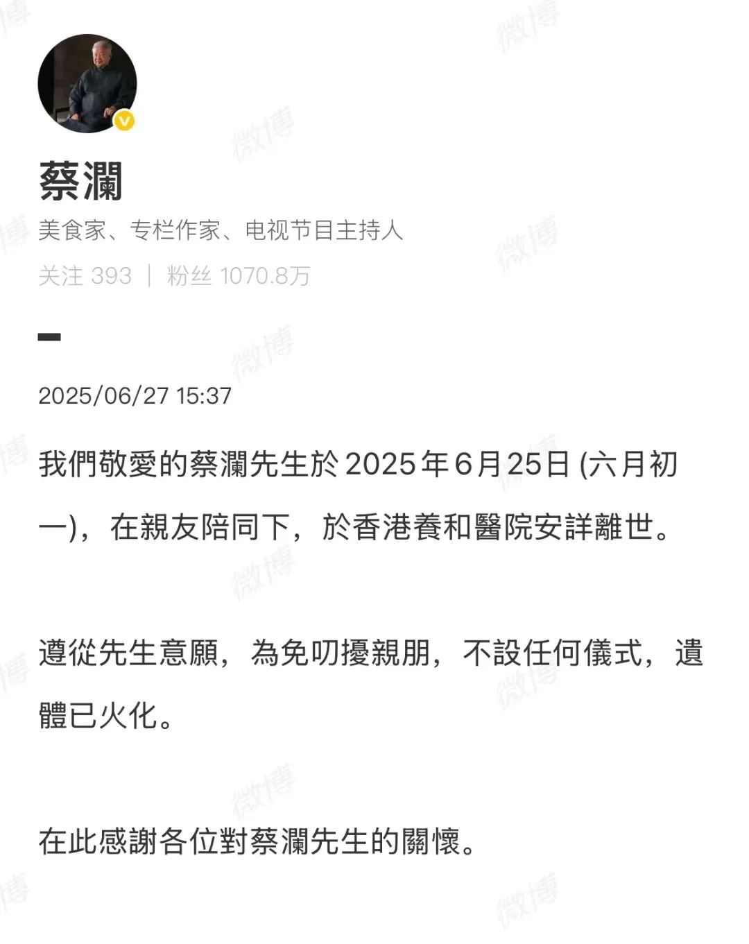 6月27日下午,“蔡瀾”個人微博發佈訃告:先生已安詳離世,並遵從其寧靜辭別塵囂的遺願,不設任何儀式,遺體已火化。