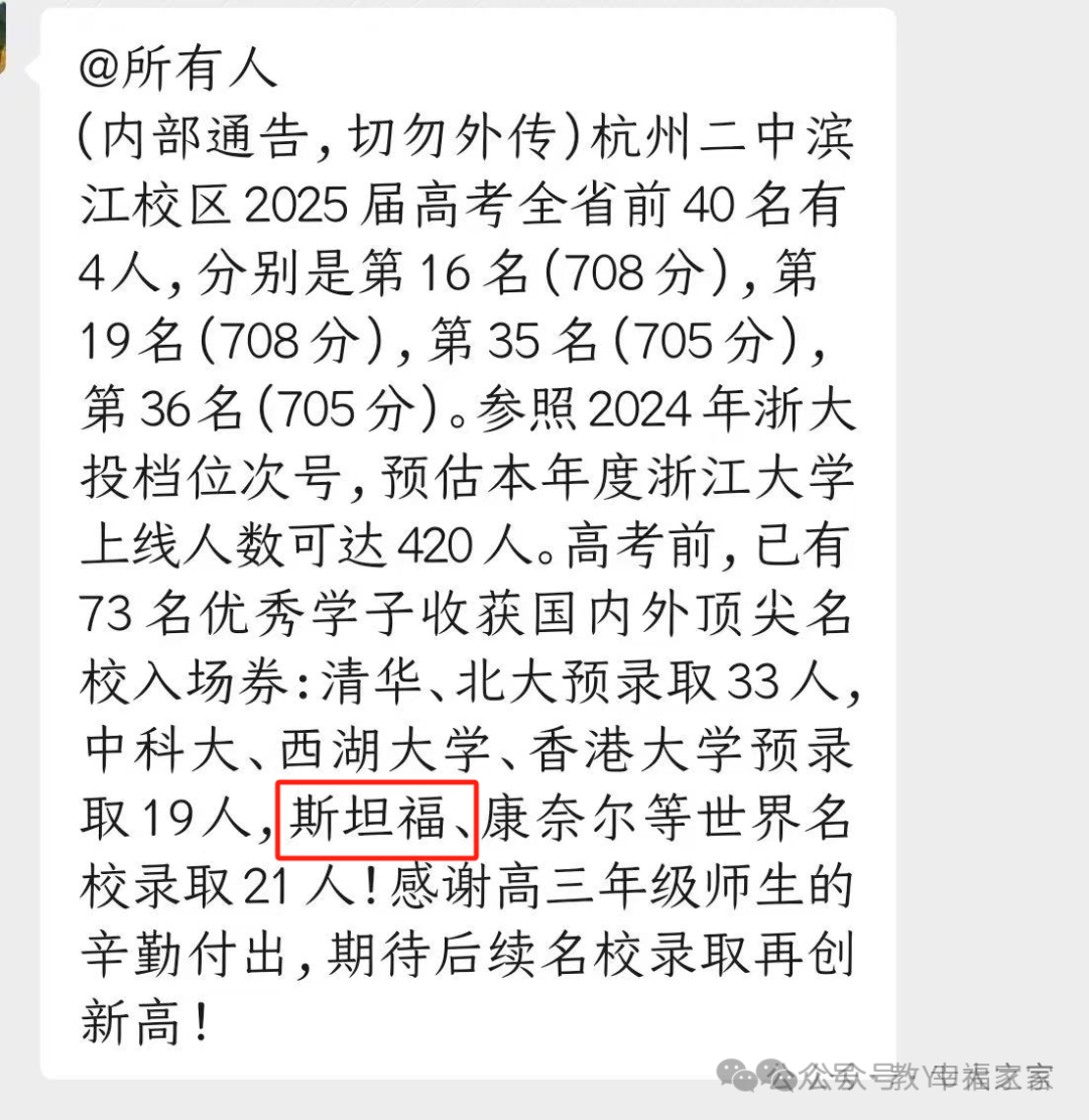 迴避2025年高考成績“斷層差距”,先發布“安內”《通告》:“@所有人(內部通告,切勿外傳)杭州二中濱江校區2025屆高考……”,後發佈“攮外”《喜報》:“全省前40名4人,分別是:省16名708分,省19名708分,省35名705分,省36名705分。還有清北預錄取33人,中科大、西湖大學、香港大學預錄取19人,斯坦福、康奈爾等世界名校錄取21人! ”