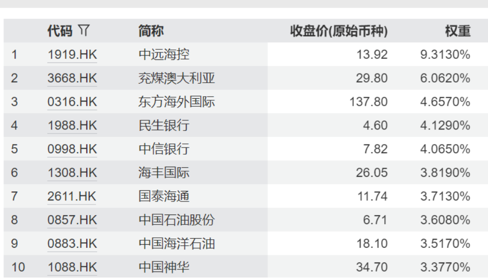 權重股方面,根據基金一季報數據,天弘中證港股通高股息投資指數基金A(022072)前十大重倉股佔比約43%,為中遠海控、兗煤澳大利亞、中國石油股份、民生銀行等金融、資源、製造等盈利確定的成熟行業龍頭個股,具備較高的行業護城河和股息率。