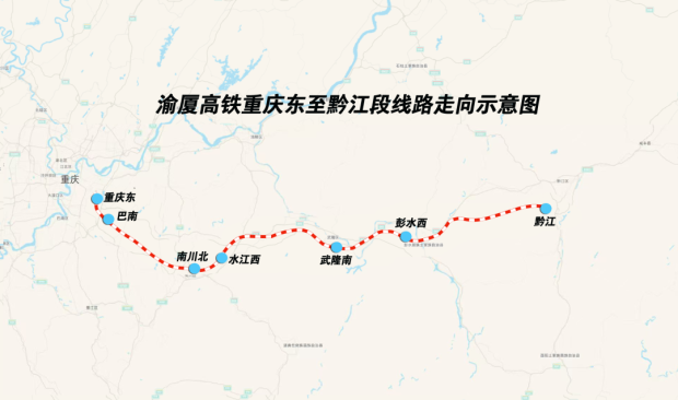 早在2019年12月,黔常鐵路開通,結束了湘、渝、鄂三省市交界地帶無鐵路的歷史,但黔江至重慶城區仍屬於“斷頭路”,長沙高鐵至重慶需由湖南懷化、貴州貴陽一線繞行,黔江至重慶城區普鐵也需要4小時之久。