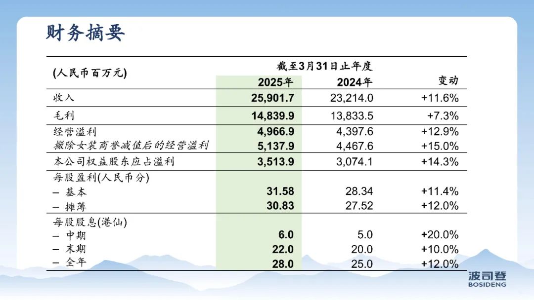 業績的穩健增長離不開公司近年來持續聚焦主業的發展戰略,2018 年以來,波司登重新聚焦主航道與主品牌,實現品牌的再次騰飛。24/25財年,波司登錨定“聚焦羽絨服主航道、聚焦時尚功能科技服飾主賽道”的“雙聚焦”戰略方向,波司登收入提升11.6%至約人民幣259.02億元,實現了穩中有進的發展目標;淨利潤高速提升13.9%至約人民幣35.53億元,營收和淨利潤連續8年創同期歷史新高。其中經營溢利增速再次快於收入增速,企業經營效率提升,經營溢利提升12.90%。