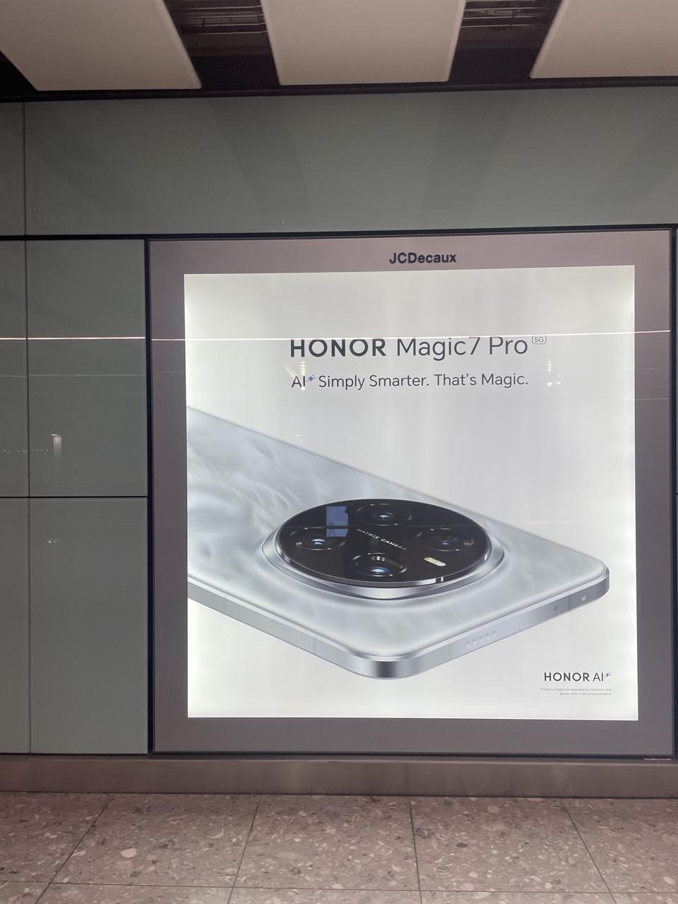 走了一段電動步道後,榮耀Magic7 Pro的廣告出現了,廣告詞強調AI,重科技、重研發,也算是跟緊了發達市場的偏好。事實上這些年榮耀出海做得相當不錯——尤其是在2020年年底,與華為剝離之後,榮耀有了更多的空間做產品,也繼承了華為被制裁後空出的高端市場。所以,在人們關注“非洲之王傳音”“小米進拉美”時,榮耀的打法與其相反,主打用高端旗艦機衝擊發達市場。