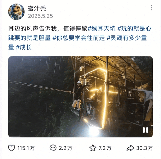關鍵是,網友一句“適合拍立體機動裝置cos”,更是給蹦極這事賦予了一股神奇的使命感,讓此地完成了變身熱門打卡地的躍遷。