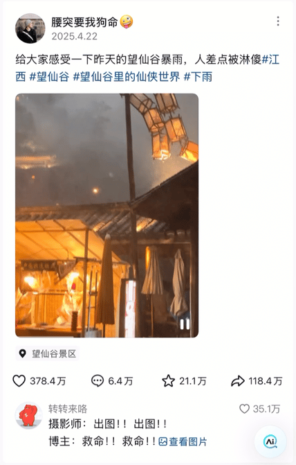 即便是隨手拍下的暴雨傾盆狼狽現場,也能讓無數網友解讀出“仙俠世界”的段子來,反而激發旅遊慾望。