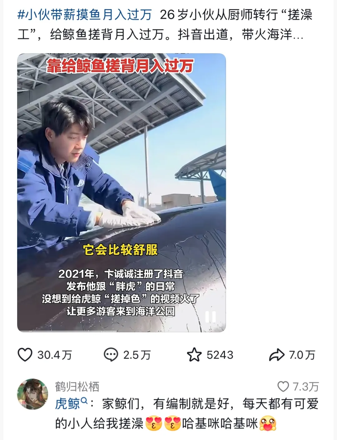 上海海昌海洋公園裏的保育員,每天負責照顧鯨魚,宣傳時很有網感地把工作説成了“搓澡工”,大夥樂呵着看完,順手就點開了團購鏈接。