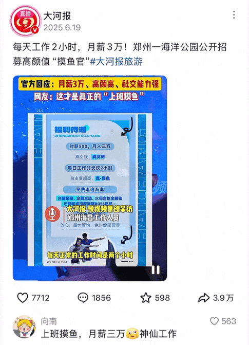 鄭州海昌海洋公園,在發佈要月薪三萬招“摸魚官”的視頻後,不僅來求職的人擠滿了,大量遊客也跟着湧入,想瞅一眼帶薪摸魚是什麼光景。