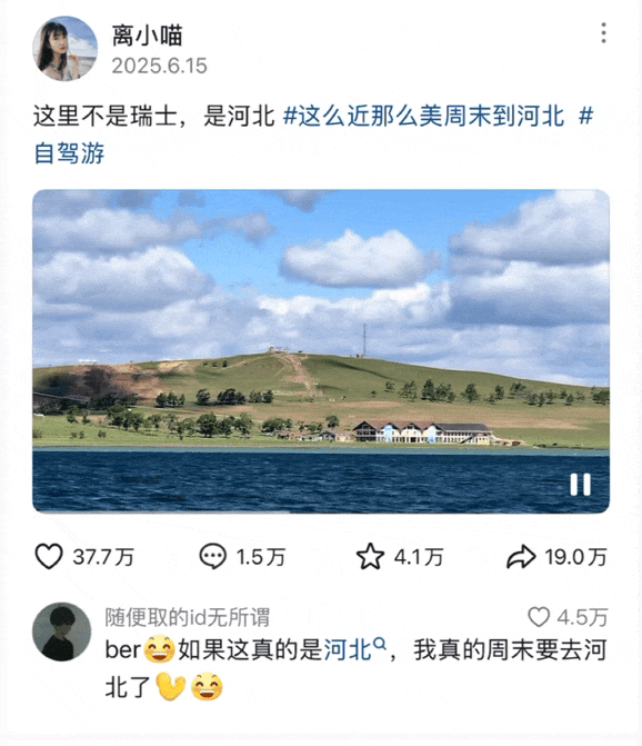 比如你一條河北隨手拍,附贈個“不是瑞士是河北”的總結,真的能讓不少人“週末來河北”。