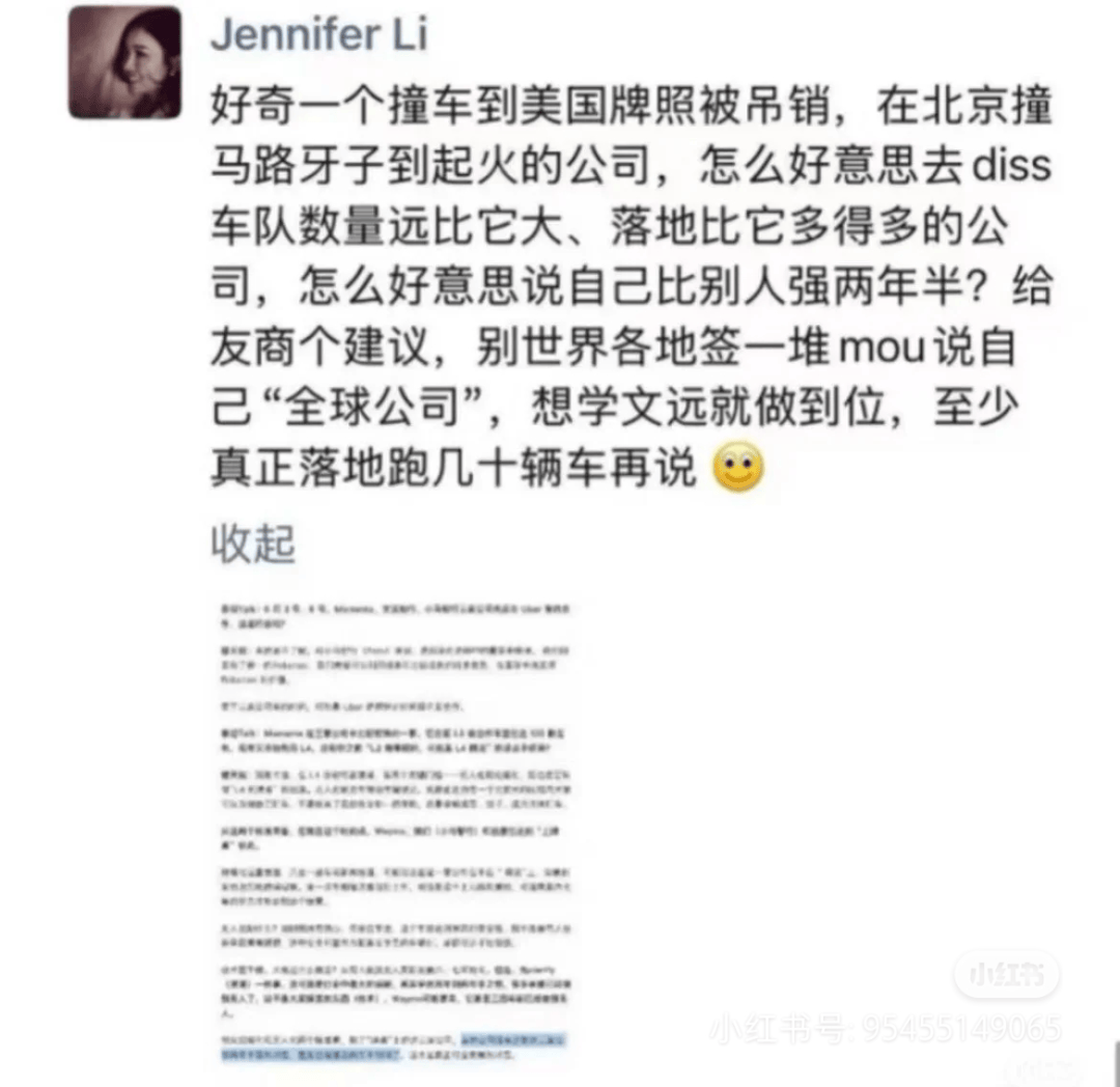 文遠知行CFO李璇在微信朋友圈火力全開,言辭激烈地進行回擊。