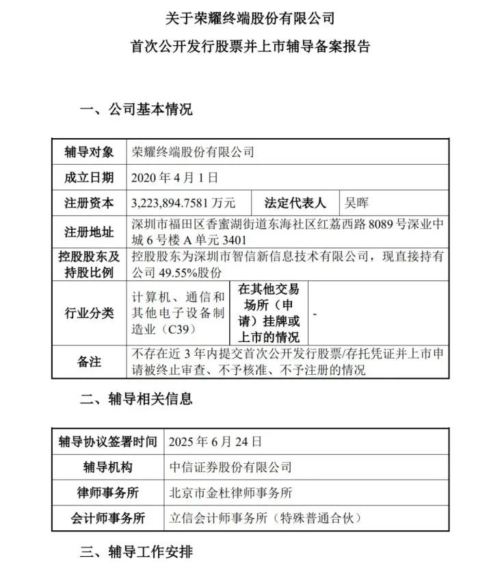 2025年6月26日,證監會官網披露榮耀已完成上市輔導備案,輔導券商選定為中信證券,計劃於2026年1月至3月完成上市輔導工作。
