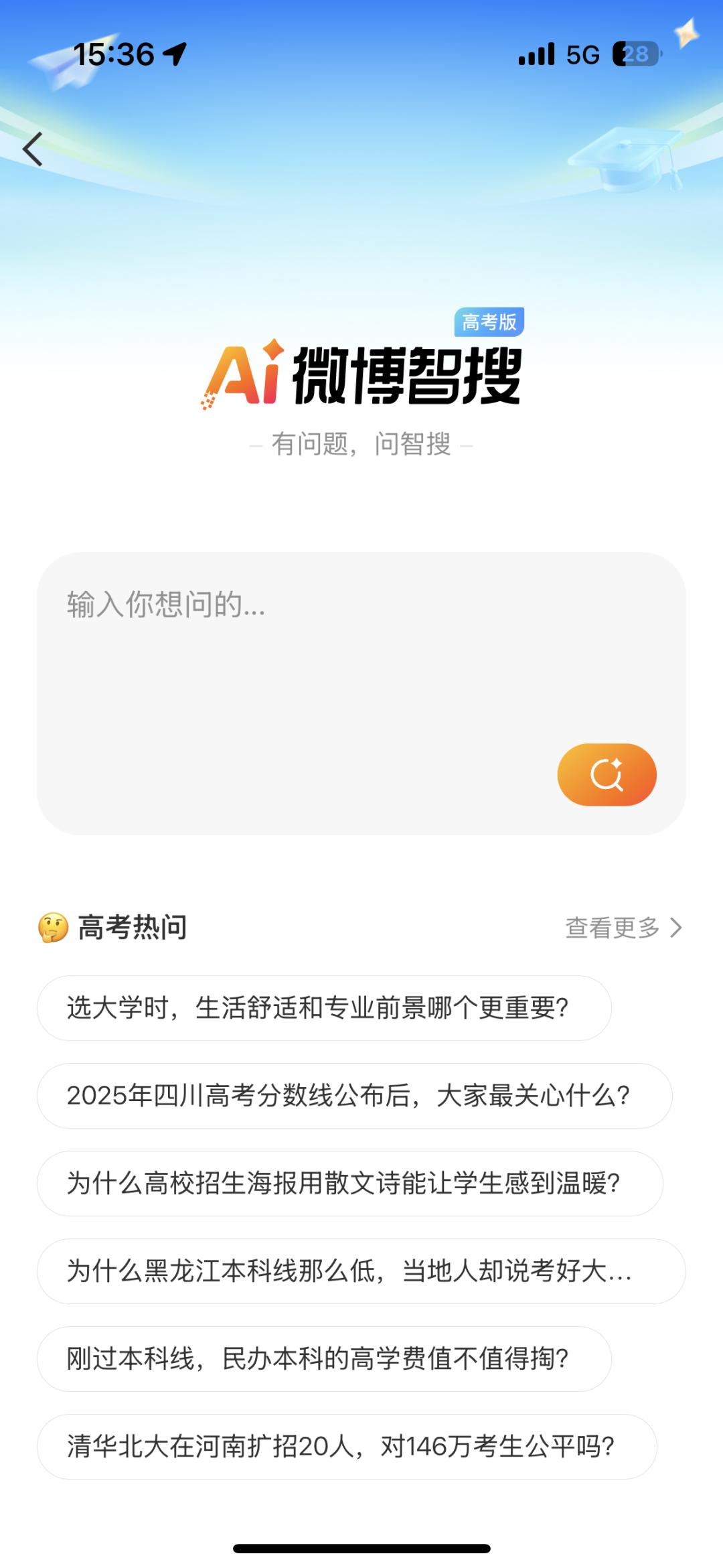 因此,他頻頻打開微博,搜一些行業大v的看法。而在這個過程中,他發現,微博上有一個智搜功能(最近推出了高考版),用AI去整合人的經驗,將平台上活躍的大V、深耕行業的專家、親歷校園生涯的學長學姐們所產生的“人類經驗”彙總起來。比如,搜“機器人專業值得報嗎”,智搜挖掘、整合各路科技大V對學科的解讀、對政策與國家戰略的分析、行業頭部創業者的心路分享和內幕消息,進行行業本質的剖析和前瞻趨勢洞察,從認知層給你參考。