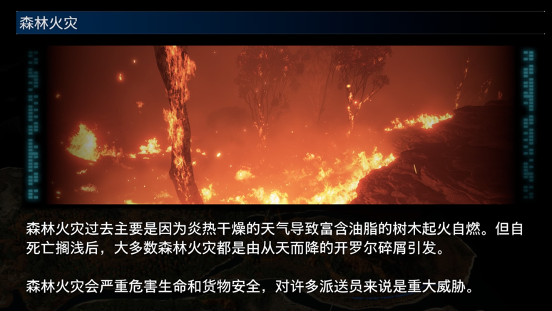 相比前作,這代的大世界顯得更加真實,玩家在送貨時不僅有地形阻攔,更會頻繁的遭遇如“地震”“洪水”“火災”等災害,更符合一個末世背景下的世界樣貌,這些自然現象也被編劇套上了一層“超自然版本”。