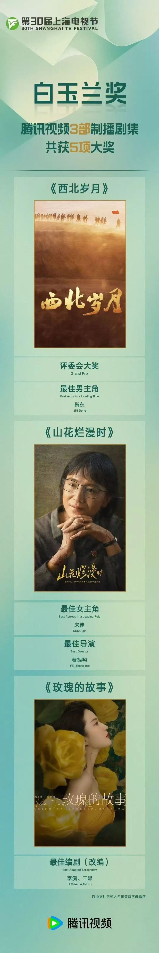6月27日晚,第30屆上海電視節白玉蘭獎公佈,其中包括評委會大獎——《西北歲月》,最佳男主角——《西北歲月》靳東,最佳女主角——《山花爛漫時》宋佳,最佳導演——《山花爛漫時》費振翔,最佳編劇(改編)——《玫瑰的故事》李瀟、王思在內的5項劇集大獎,均由騰訊視頻包攬。