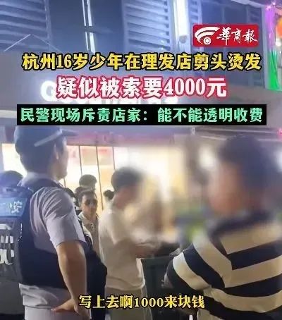 杭州一個16歲的少年,獨自一人去街邊的理髮店燙頭,在燙完後,卻被理髮師要求付款4000元。