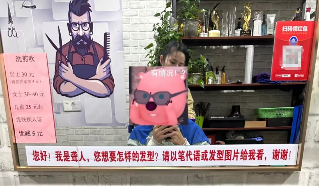 杭州臨平區的“曉珍發藝”老闆娘曉珍是聽障人士,跟顧客交流全靠紙筆或者髮型圖片。
