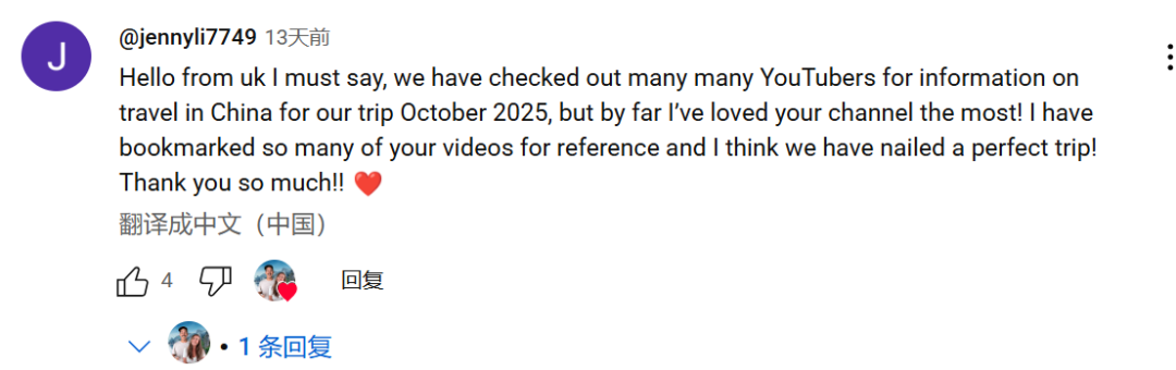 評論裏面也有英國網友説在準備今年10月份的中國旅行,所以她查看了很多youtuber的中國旅行視頻,覺得這個頻道的內容最好。