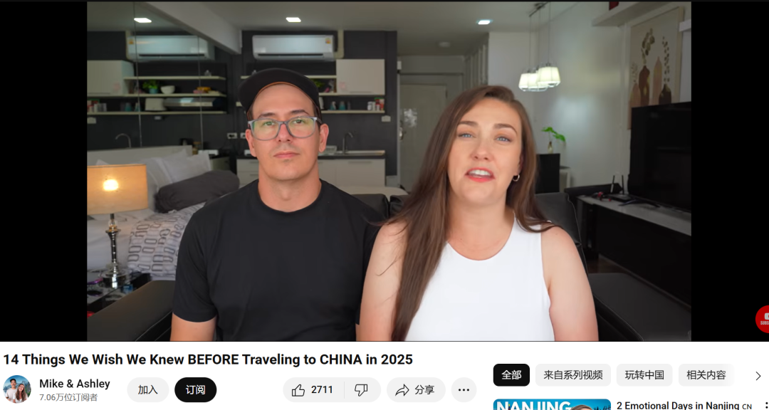 這對美國夫妻Mike and Ashley,他們在油管有7.05萬粉絲,來過兩次中國,第一次是過境簽證只待了幾天(當時是144小時),因為覺得不錯所以又申請了10年多次簽證,在中國又玩了兩個月,去過了很多中國的城市。