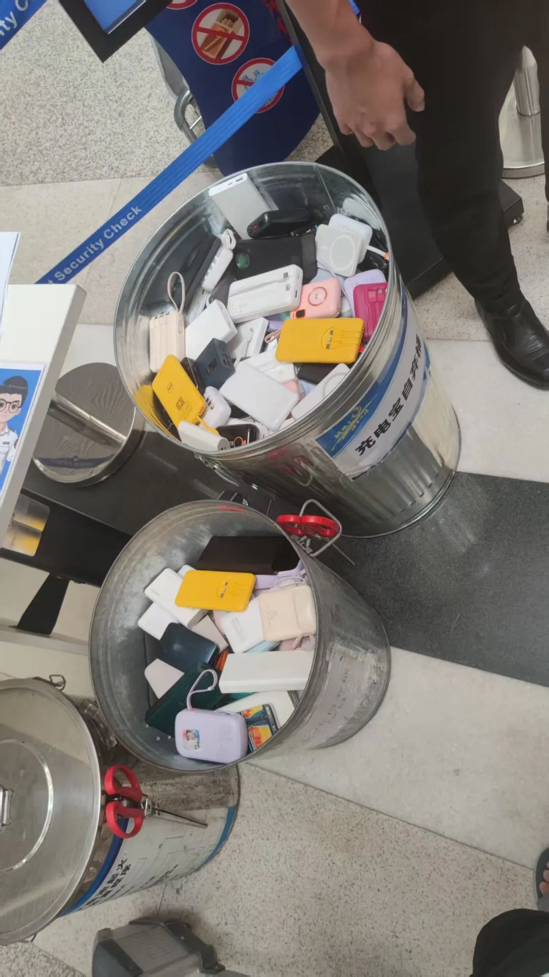 大部分機場在處理不合格充電寶的時候,都是把充電寶放在框裏再統一運走。