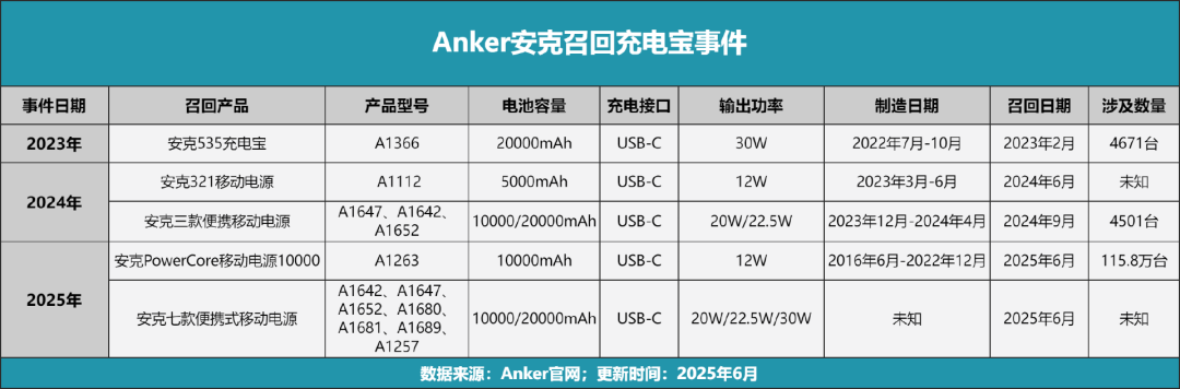 沒過幾天,國產移動電源龍頭安克公司也發佈了召回公告,宣佈在國內召回7款共計71萬台充電寶,而在美國市場更是召回115.8萬台。