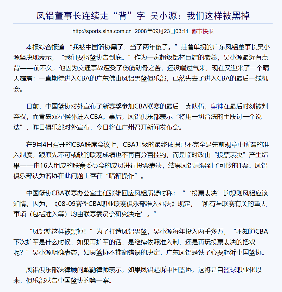 另一方面,鳳鋁認為他們成績第一,包括老闆吳小源在內都覺得,“既然我們成績壓過天津,那就沒問題了”。按照當時的准入規則,關於成績一項的評分是以過去兩個賽季為基準,最靠近准入評估賽季的成績積分判定係數更高,鳳鋁在2007年拿到NBL亞軍,2008年是冠軍,這一項確實是當時NBL第一名。