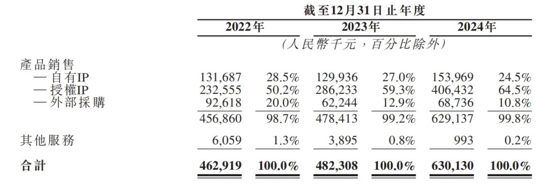 翻開52TOYS的招股書,一組數據也格外刺眼,2024年其自有IP收入佔比僅 24.5%,授權IP貢獻了64.5%的營收。以其核心爆款“蠟筆小新”系列為例,2024年,公司營收為6.30億元,而蠟筆小新玩具整體實現GMV超過3.8億元。這意味着,公司2024年6成營收大致可以看作是由蠟筆小新貢獻的。