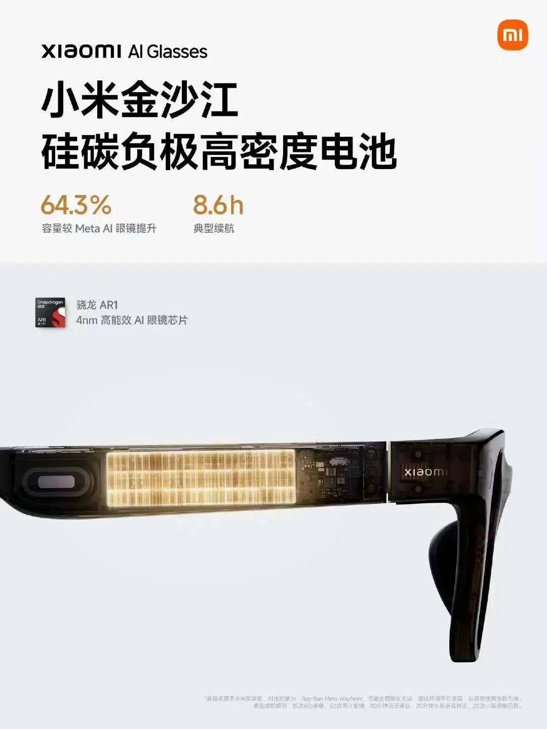 首先,小米的入局或會帶來技術革新。比如,之前多家公司的AI眼鏡續航能力不足,用户不能長時間佩戴眼鏡。**小米此次推出的AI眼鏡提升了續航能力,典型續航8.6個小時,電池容量比Meta的AI眼鏡大64.3%,也提升了充電速度。**這會迫使其他廠商對AI眼鏡的研發,加速技術迭代。