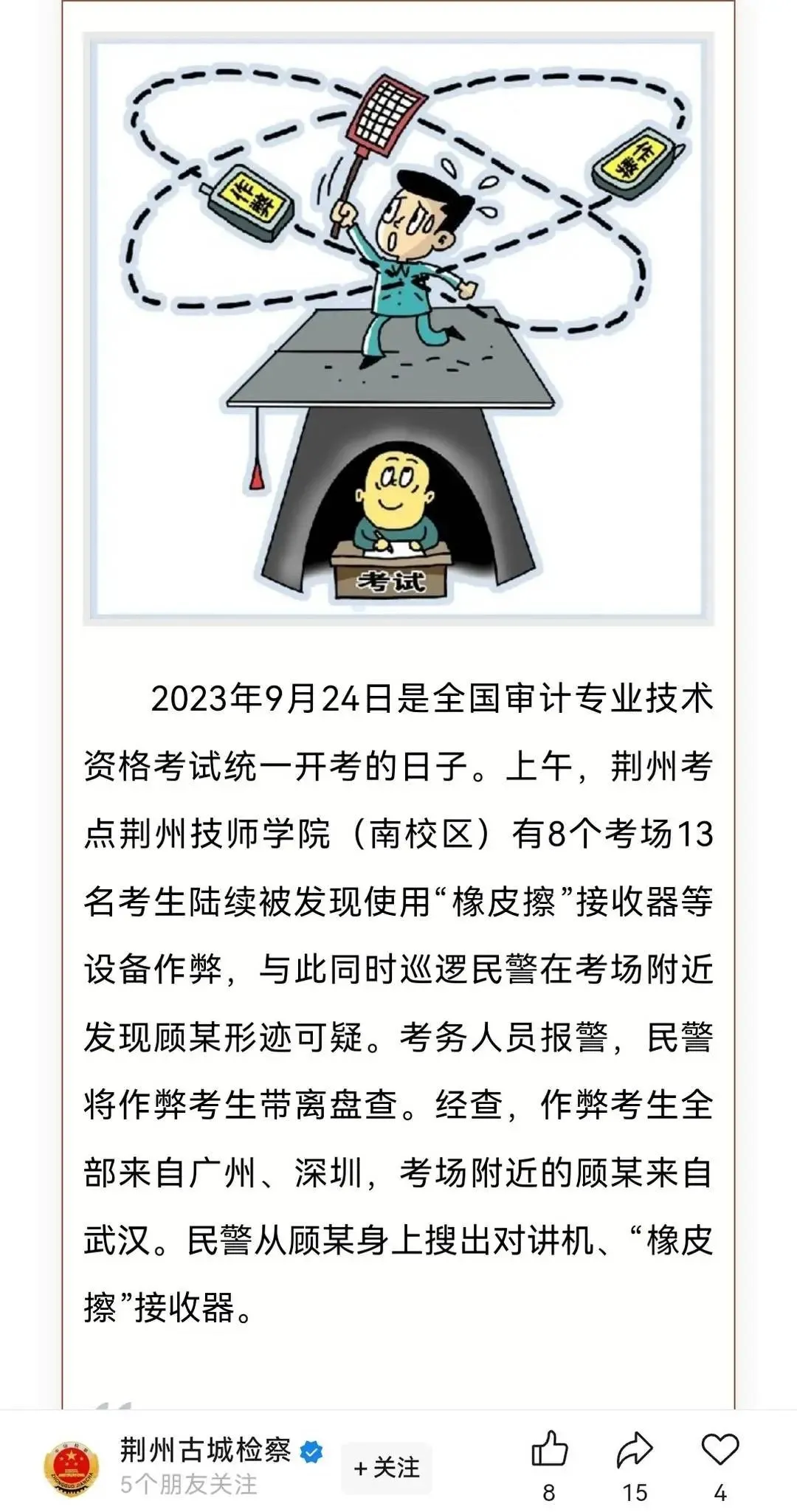 4天后,荊州人社局官網通報了這起作弊案,表示現場抓獲15名作弊考生,場外抓獲一名組織團伙成員。