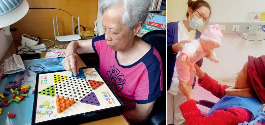 左圖:劉欣悦的外婆在玩玩具。右圖:北京老年醫院一位患者經常抱着娃娃。圖/受訪者提供