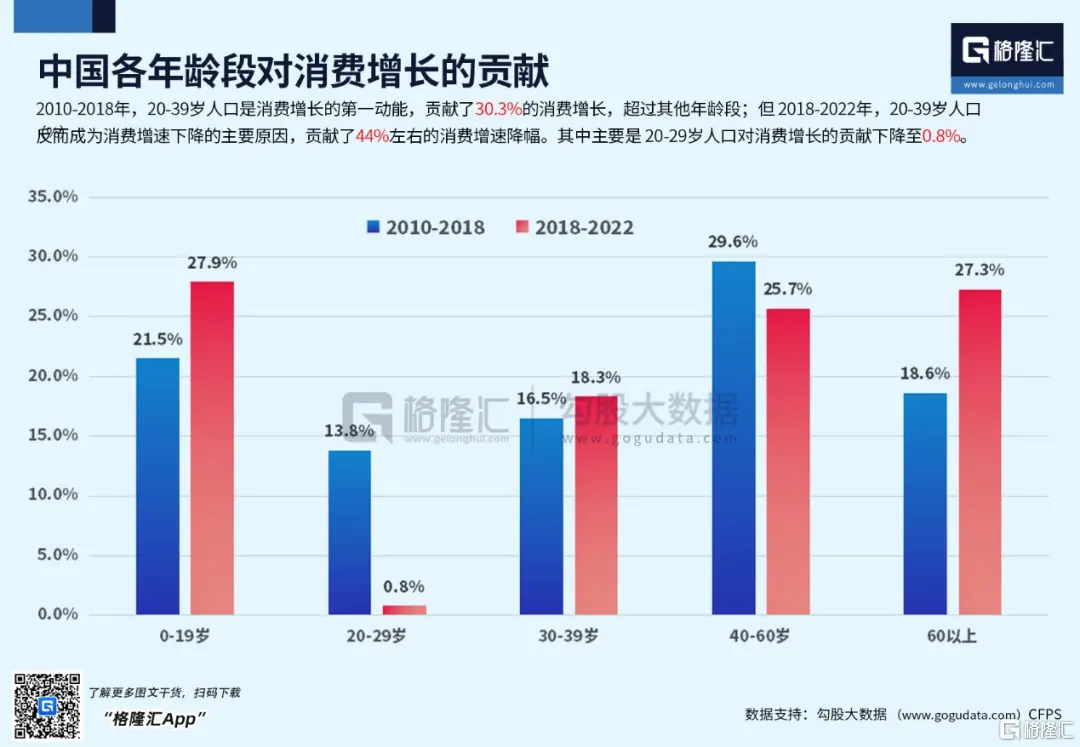 大家看一下下面這張圖:2010-2018年,社零消費年複合增速為12%,2018-2022年年均增速降到了6.1%,而從不同年齡段的消費情況來看,20-39歲人口是消費增速下降的主要原因,貢獻了44%左右的消費增速降幅。