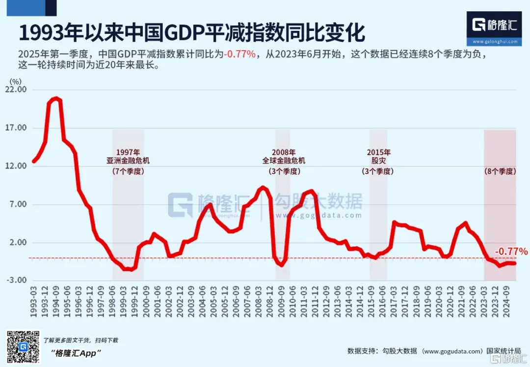 一個經濟體的支出來自於兩部分,貨幣和信用,信貸是經濟中最重要的組成部分,獲得信貸,增加支出,驅動經濟上行。信貸需求大幅降低,消費不振,結果就是經濟通縮。我們的GDP平減指數已經連續8個季度為負,這是該項數據有統計以來最長時期的連續負增長。
