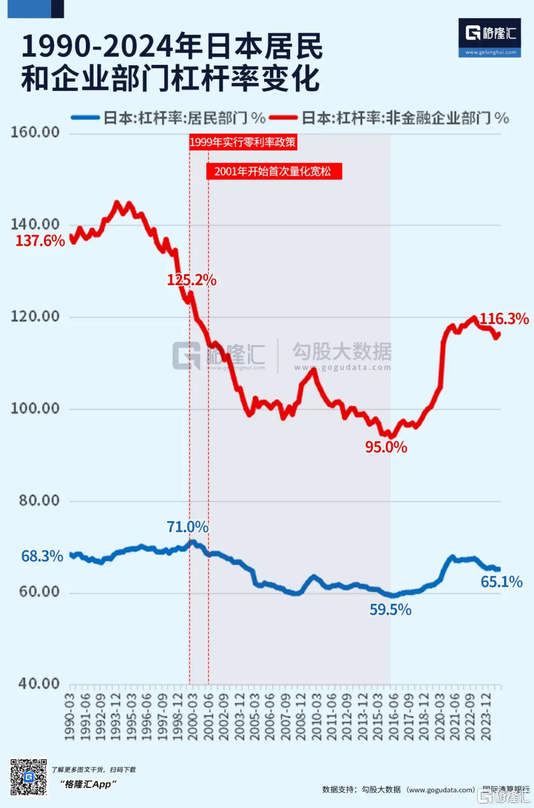可是這些極度寬鬆的貨幣政策並沒有快速扭轉日本居民和企業部門的去槓桿進程。日本央行1999年就把利率降到0,可是2000年到2015年,這15年的時間,日本企業和居民仍舊在加速去槓桿。1999年到2015年,日本企業部門槓桿率從125.2%降至低點98%,居民部門槓桿率則從71%一路降至59.5%。