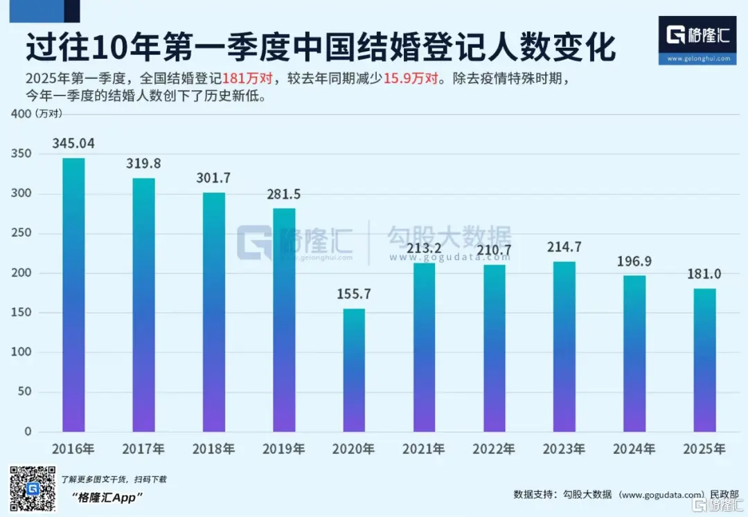 比如,結婚人數大幅減少。2025年第一季度,我國結婚人數降至181萬對,較去年同期減少15.9萬對。除去疫情特殊時期,今年一季度的結婚人數,果斷創下了歷史新低。