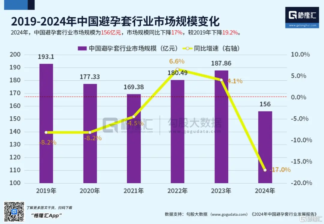 格隆直接上數據:2024年中國避孕套市場規模156億元。這是什麼概念呢?2023年避孕套賣了187.86億元。2024年足足下降了17%——這個數據,比偉哥,更加“蕭條”。