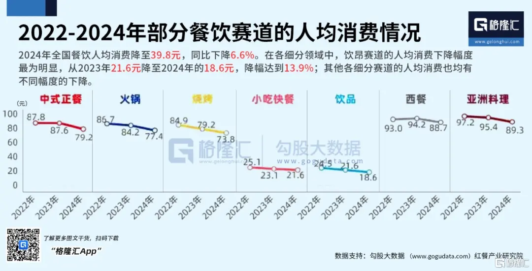 從人均消費數據來看,數據更是糟心。2022-2024年,中國餐飲人均消費值持續下滑。大家看看下面我們的數據圖一。數據顯示,2024年,全國餐飲人均消費已降至39.8元,這是有這個統計數據以來的歷史最低值。