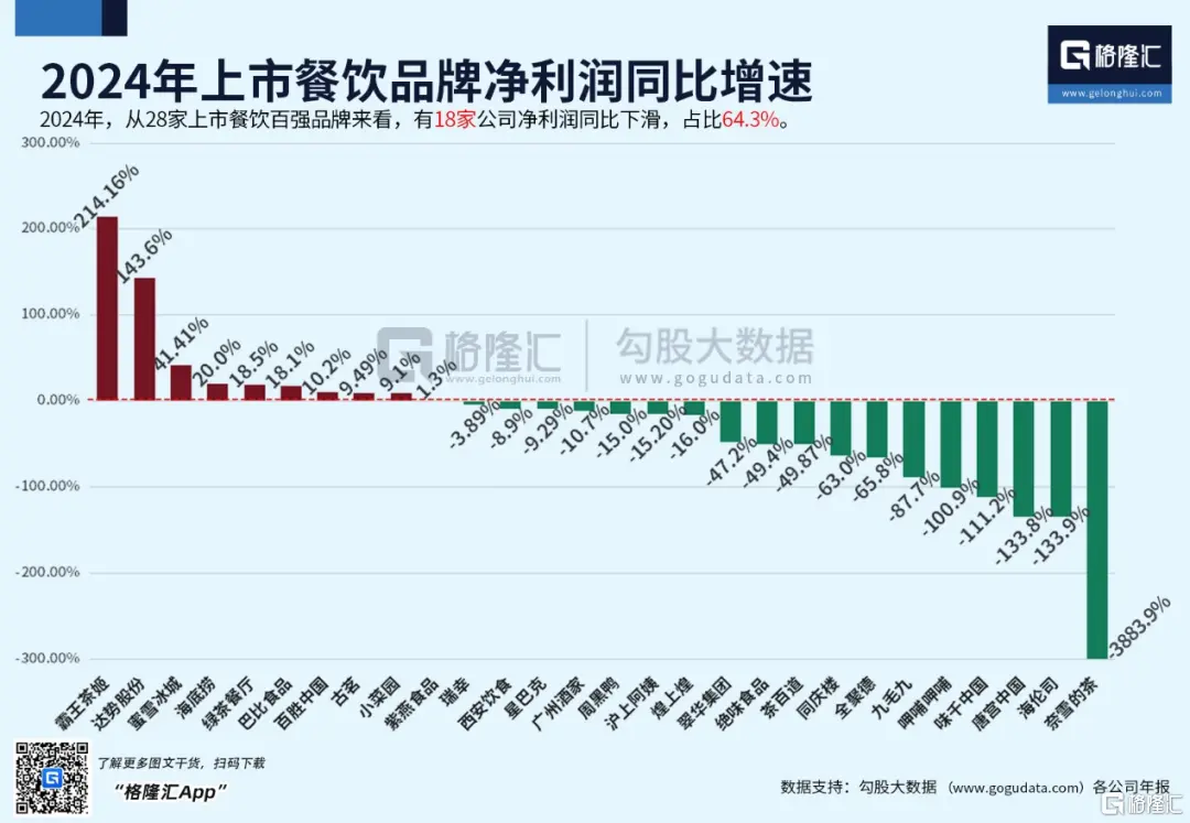 體現到行業利潤上,餐飲利潤大幅下滑。2024年,28家上市餐飲百強品牌中,有6家虧損,18家淨利潤同比增速下滑,利潤增速下降的企業佔比達到了恐怖的86%。