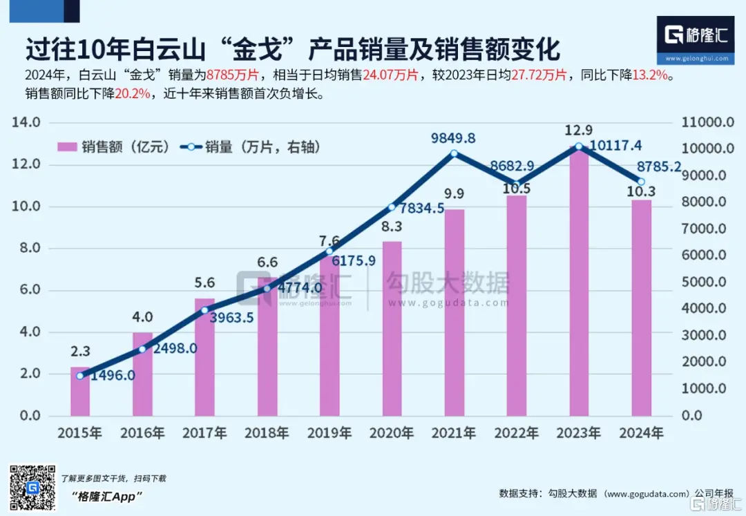 白雲山年報顯示,國產偉哥代表金戈的銷量,從2023年的1億片,大幅降到8785萬片,日均銷量則從27.7萬片降到24萬片,同比下降13.2%。銷售額呢?從12.9億元下降到了10.3億元,同比降幅為20.2%。