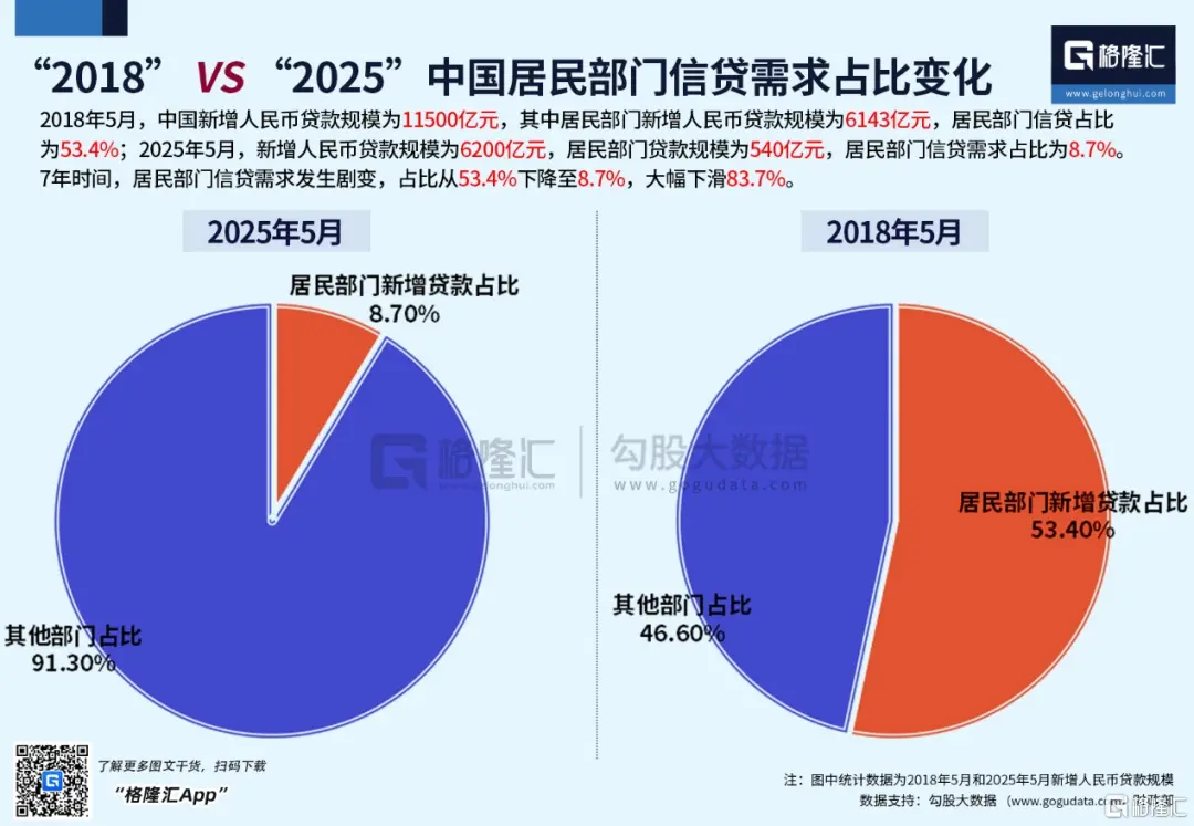 居民部門的信貸需求也在發生劇烈變化。我們仍以2018年這個拐點年做比較基準。2018年5月,居民部門新增貸款的信貸佔比為53.4%;7年後的今天,2025年5月,居民部門信貸需求佔比是多數呢?