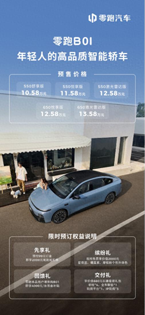 2025年6月29日,零跑汽車正式宣佈旗下全新智能純電轎車零跑B01開啓預售,預售價格區間10.58-13.58萬元。新車定位“年輕人的高品質智能轎車”,以顏值引領、續航王者、智享頂配、越級品質、超強駕控五大核心價值,精準切入10-15萬級新能源轎車市場,為泛都市圈年輕用户打造“一步到位”的高品質出行體驗。