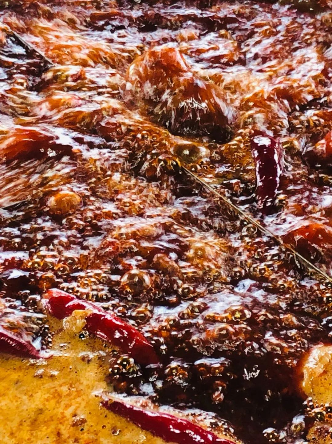 重慶吃鍋子,湯底牛油湯滴在桌布上,須臾便凝結為蠟狀;成都火鍋,湯底也放牛油,但正經火鍋店,講究底料豐富龐雜,久熬才香。但無論川渝,除非有銅喉鐵胃,輕易不敢喝火鍋湯。